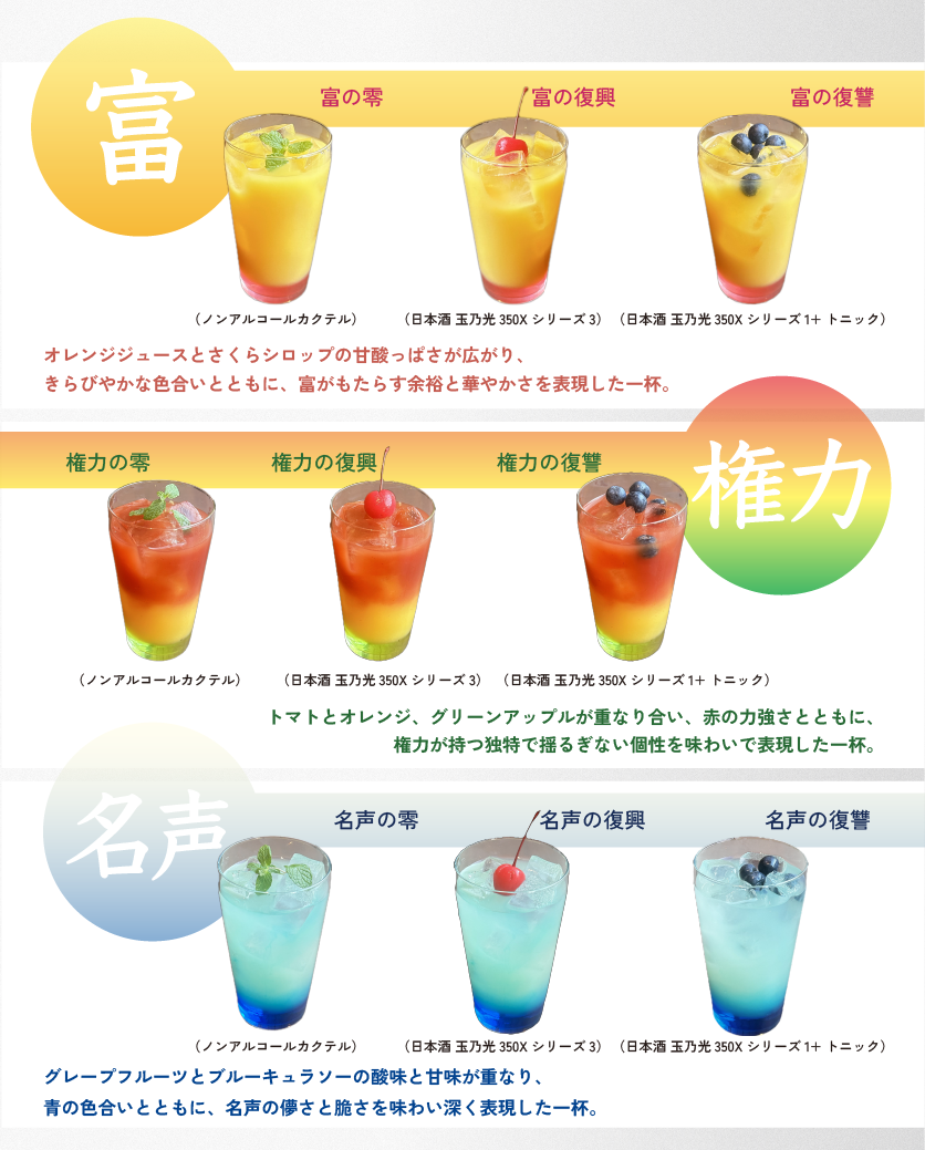 「富」「権力」「名声」 をモチーフにした、全9種類のオリジナルドリンクをご用意しています。