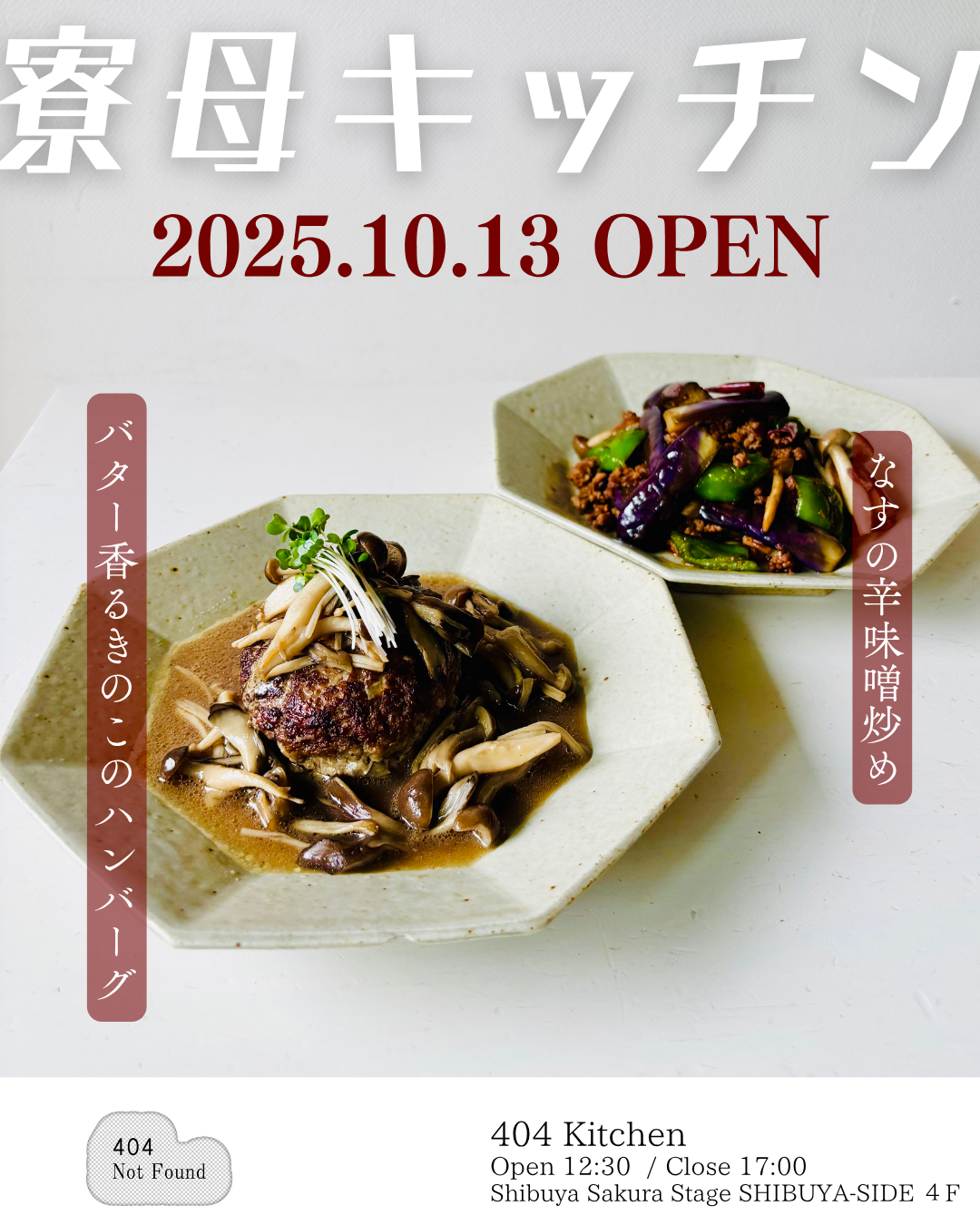 祝日の10月13日に昼12:30から17:00まで開店していますので、ぜひ渋谷サクラステージ4階の404Kitchenにお立ち寄りください!