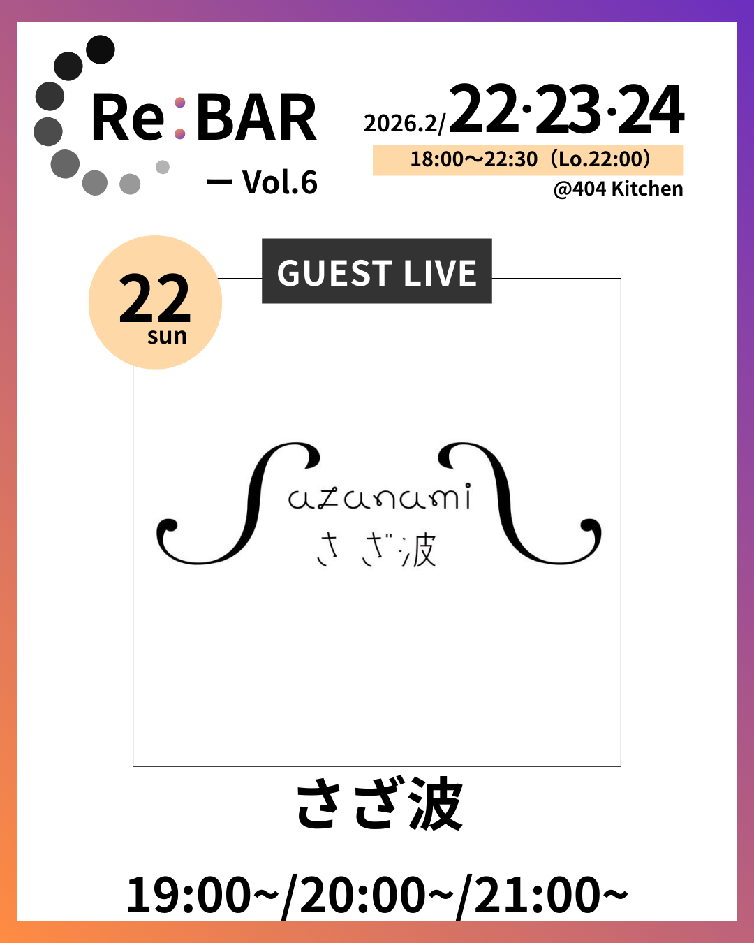 日時:2/22(日)–24(火) 18:00–22:30(L.O.22:00)