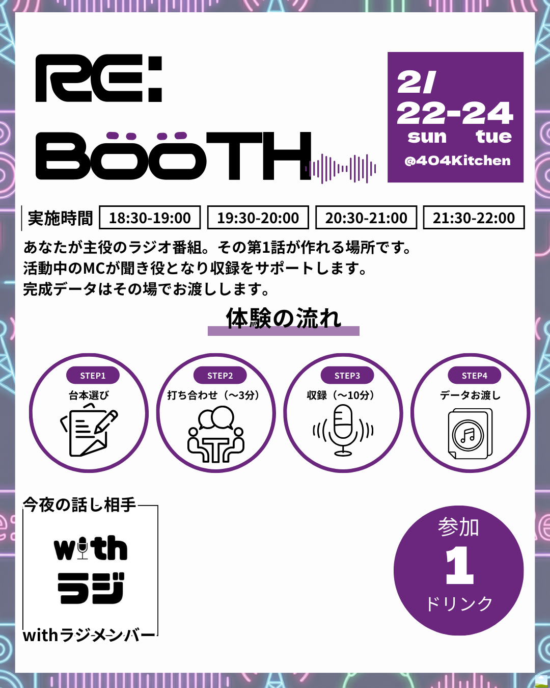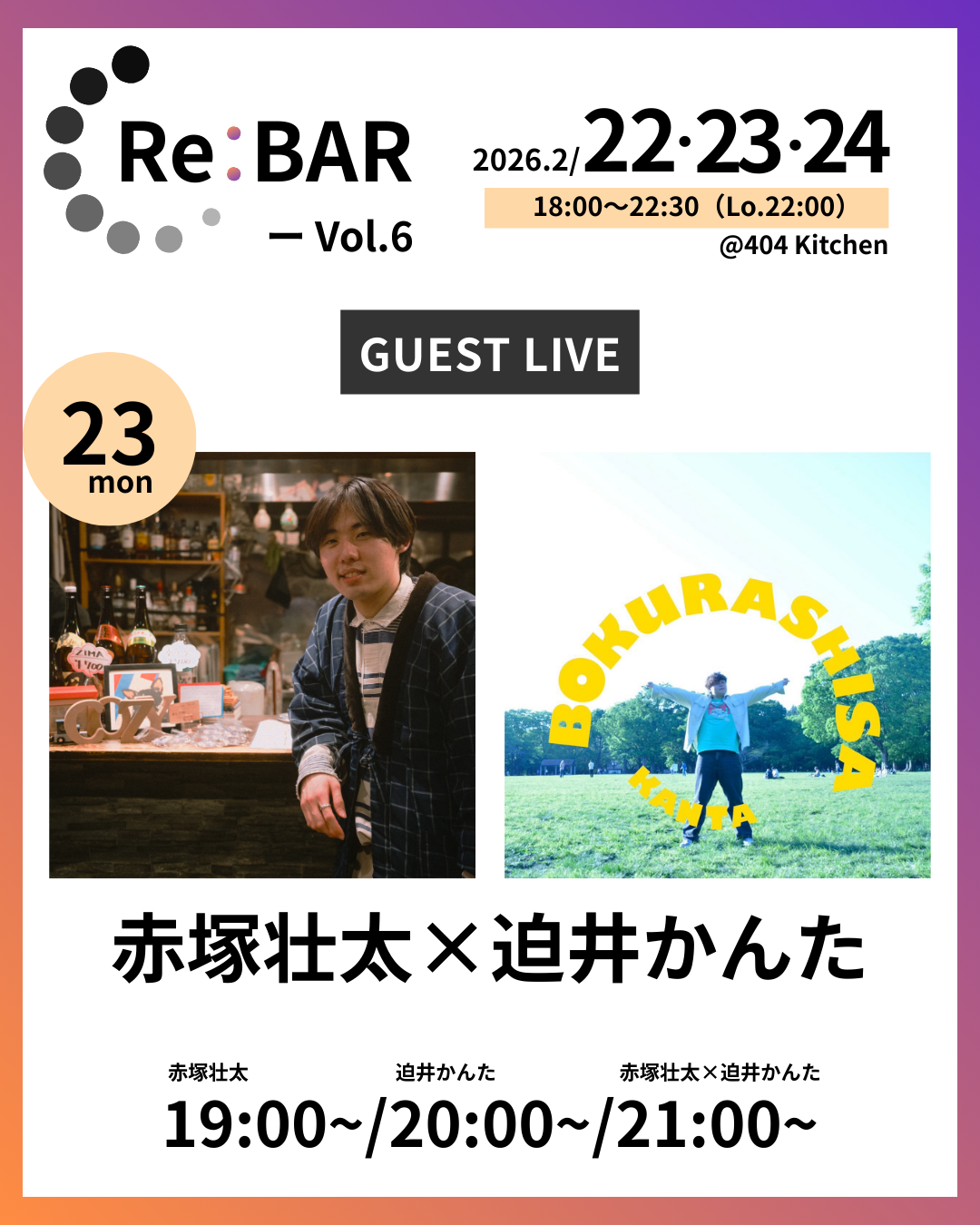 日時:2/23(月・祝)19:30/20:30/21:30